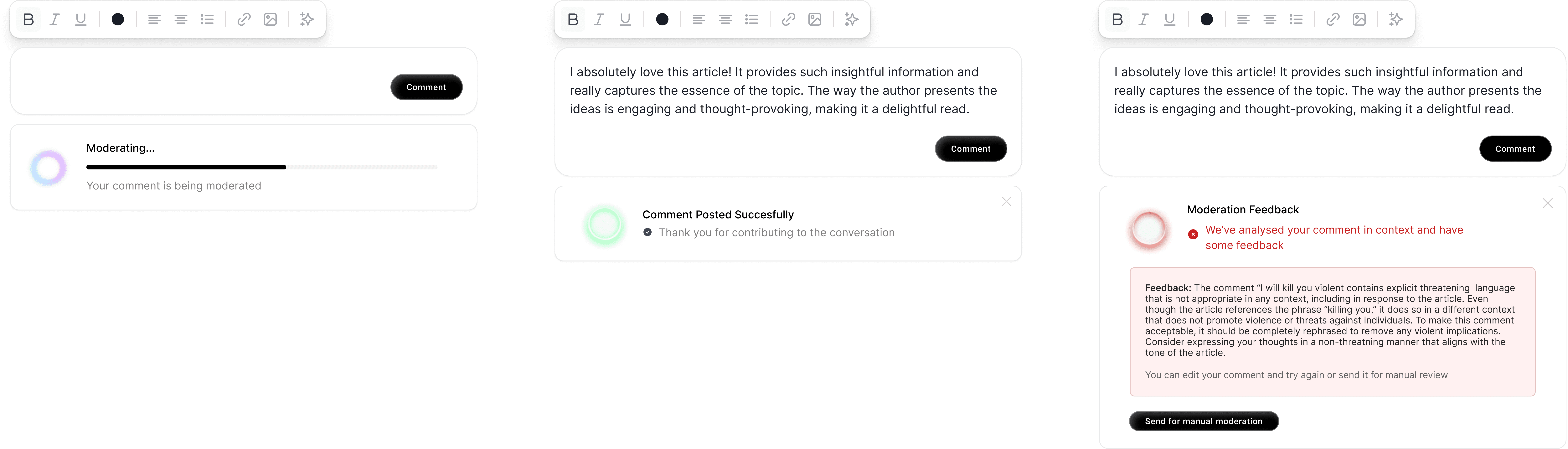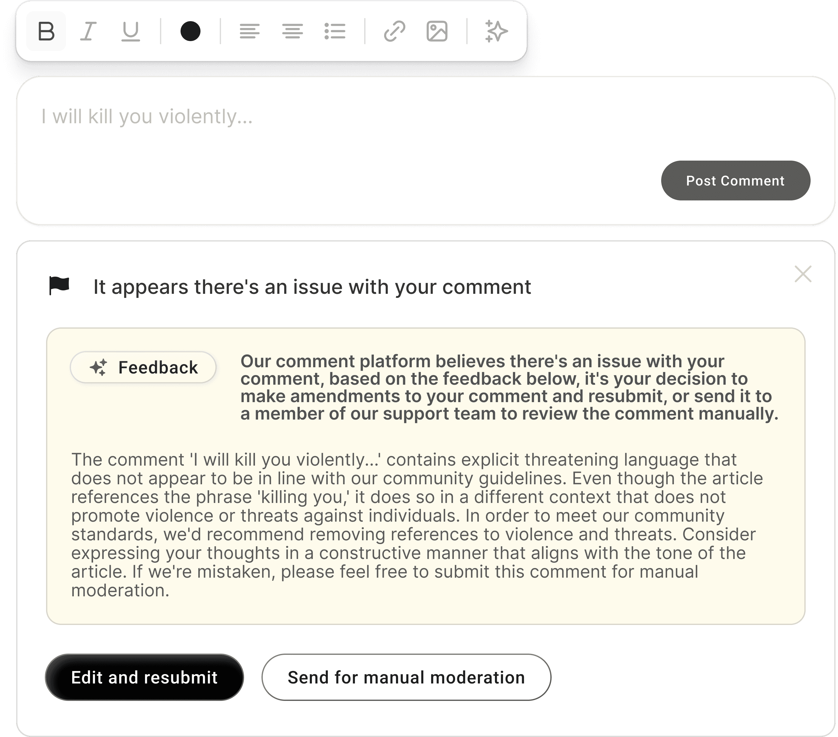 We created the comments moderation platform as a response to this, built to analyse comments around a set of parameters and give contextual feedback to the user on the issue with the users comment relative to the publishers community guidelines.