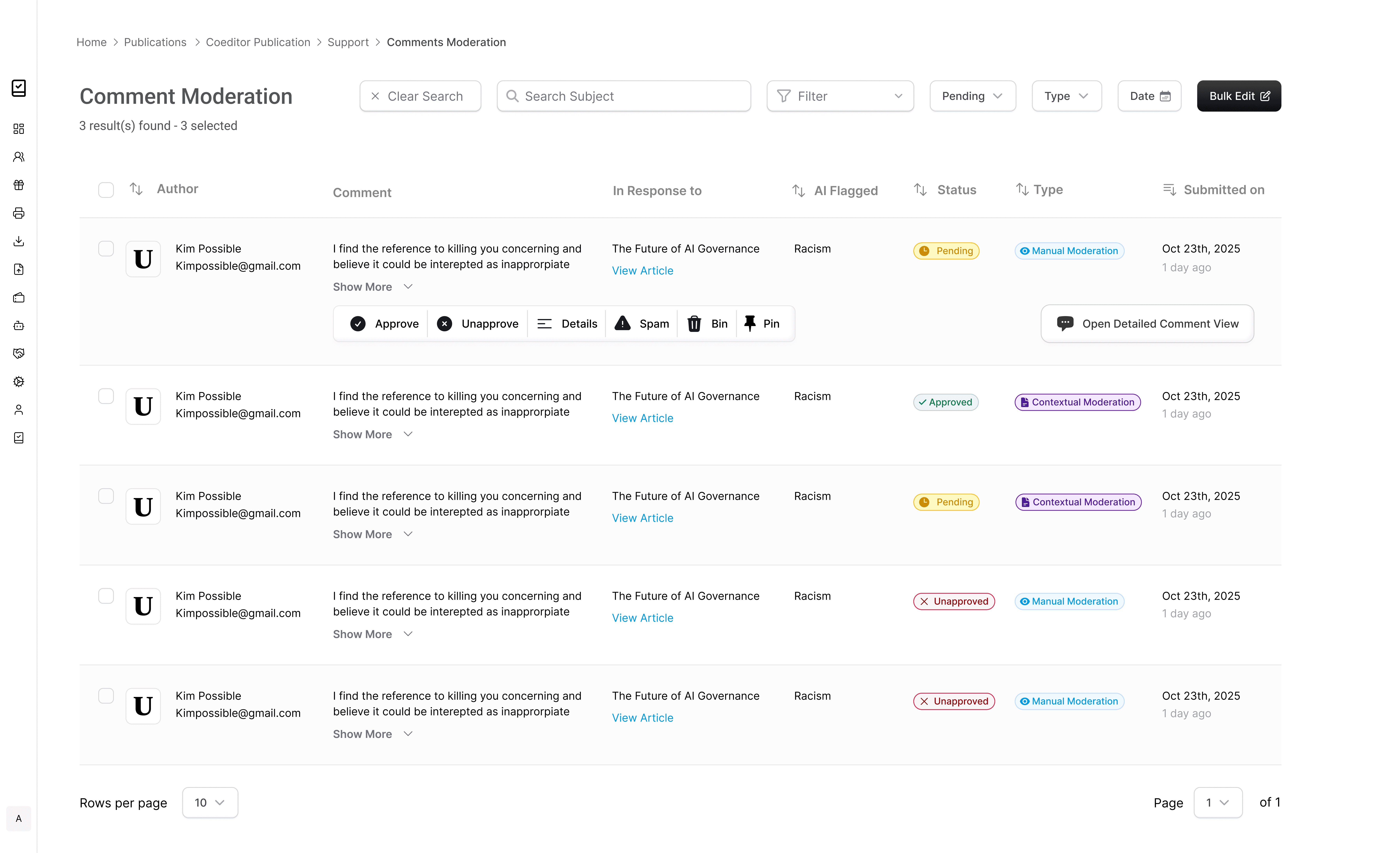 I then had to work on a platform side dashboard where moderators would find the comments which haven't passed the AI moderation check and need a human to manually go in and take on moderator actions like approve or not approve.